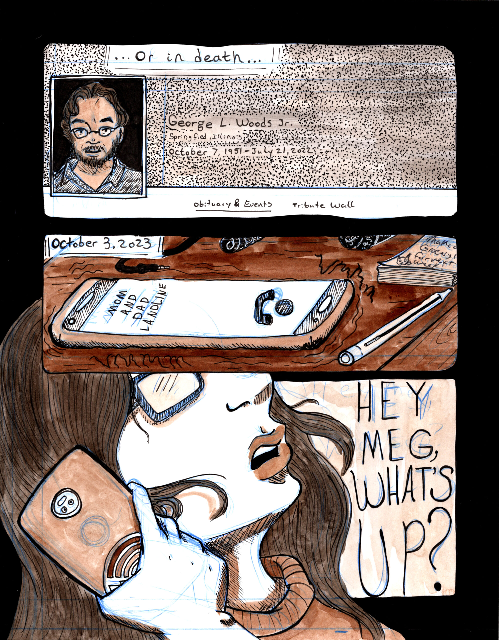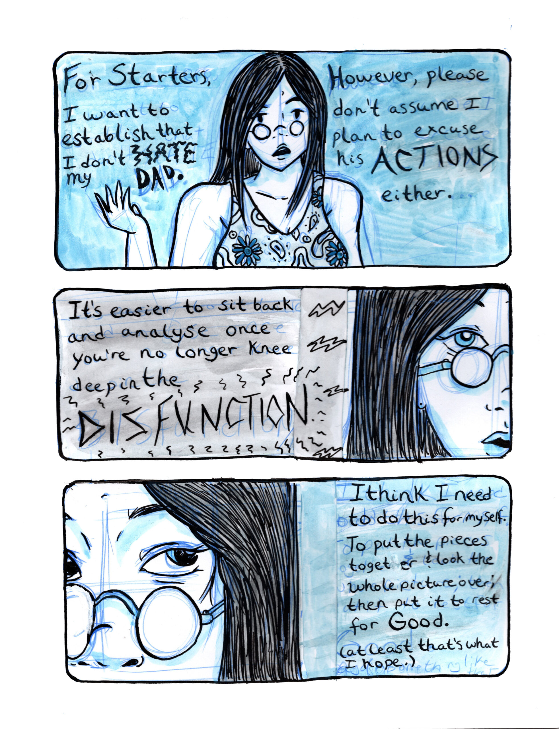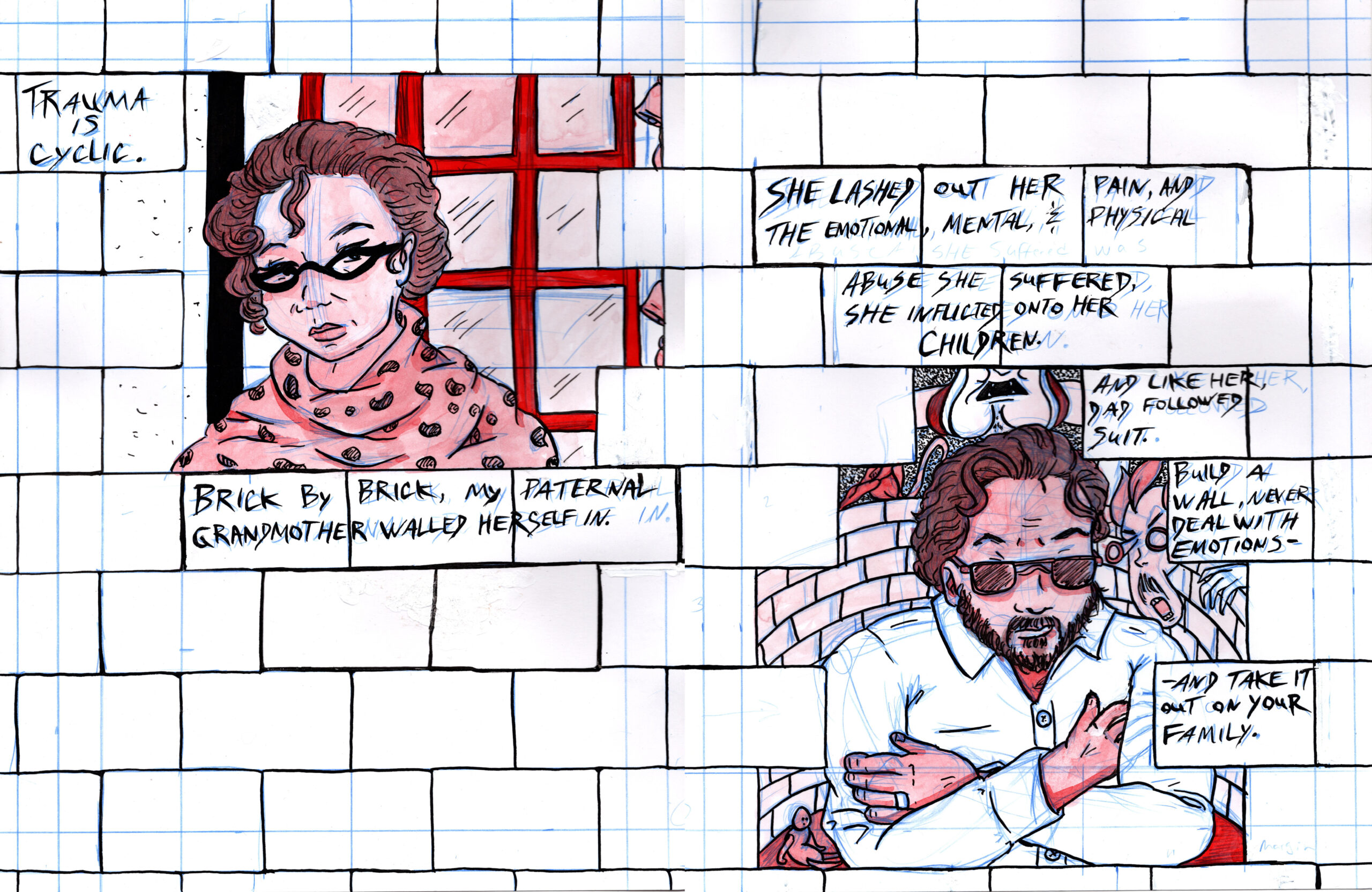 Inspired in part by Alison Bechtel’s Fun Home, but stemming from a need to process my feelings and derive some sort of closure, Turn the Page is a biographical/autobiographical search for identity and understanding through analyzing how generational trauma shaped and formed my dad and myself (along with my mother and sister). It’s a homage to a difficult balance of both loving a father who did his best, but recognizing his shortcomings. It’s about how little he was given to work with by an abusive mother who herself suffered terrible traumas from her white colonialist father during her childhood in the Philippines.